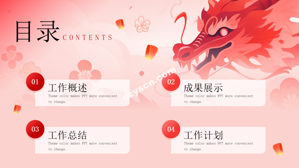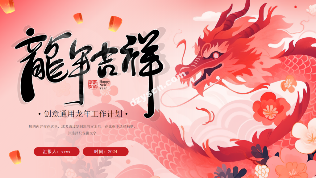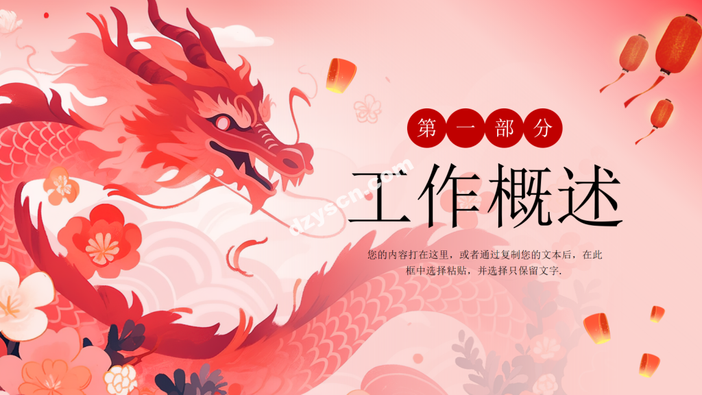本作品内容为红色创意风龙年总结计划PPT模板, 格式为 pptx, 大小15 MB, 页数为25,比例16:9, 请使用软件PowerPoint(2019)打开, 作品中主体文字及图片可替换修改,文字修改可直接点击文本框进行编辑,图片更改可选中图片后单击鼠标右键选择更换图片,也可根据自身需求增加和删除作品中的内容, 源文件无水印, 欢迎使用熊猫办公